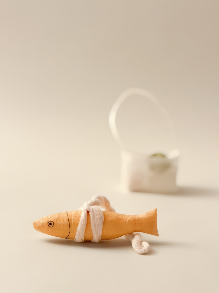 천에 무리가 가지 않도록 조심조심 몸통을 만들고, 동글동글 명태의 알같은 동그란 솜을 채우고, 실로 눈과 머리의 수를 놓아 꼬리는 금사로 장식했습니다.